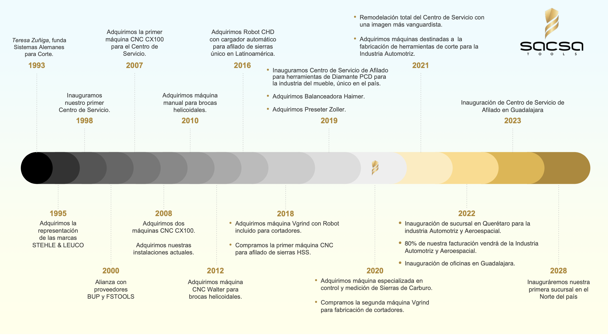 A lo largo de estas tres décadas hemos construido una historia sólida, marcada por hitos que reflejan nuestro crecimiento y liderazgo. Desde la inauguración de nuestro primer Centro de Servicio en 1998, hasta la implementación de maquinaria CNC de origen alemán, robots de afilado únicos en Latinoamérica y tecnologías especializadas para la industria automotriz, aeroespacial y mueblera, nuestro enfoque siempre ha sido ofrecer excelencia y precisión.